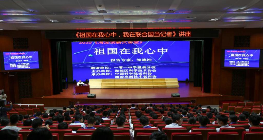 当 九一八 的警钟在耳畔回响,当民族记忆在心中激荡,在这个缅怀先烈、警示未来的特殊日子里,为纪念中国人民抗日战争暨世界反法西斯战争胜利 80 周年,9月18日下午,北京市一零一中学温泉校区举办 “海淀创新大讲堂”活动,特邀中国老科协科学报告团成员、中国科学院老科协“科普论坛”专家,人民日报原常驻加拿大、常驻联合国首席记者邹德浩高级记者以《祖国在我心中,我在联合国当记者》为主题,为高一高二年级师生带来一场直击心灵的专题教育讲座,让师生在回望历史中筑牢爱国信念,在聆听奋斗故事中汲取前行力量。邹德浩老师以深沉而富有感染力的语言,回顾了中华民族近代以来遭受的深重苦难。他用详实的历史资料,讲述了在帝国主义列强侵略下,中国人民所经历的屈辱岁月。特别是抗日战争时期,无数革命先烈为了民族独立和人民解放,抛头颅、洒热血,用生命铸就了伟大的抗战精神。