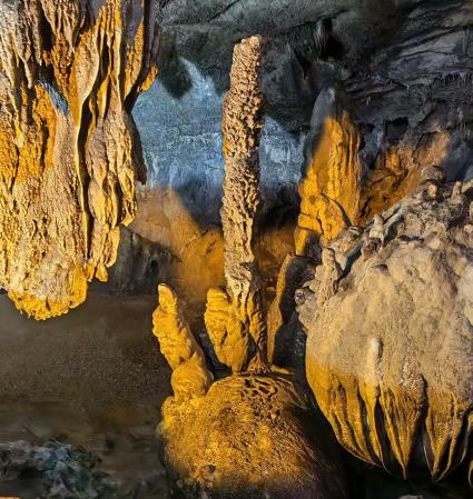 溶洞内石灰华沉积 溶洞内黑暗环境中生长的蕨类植物