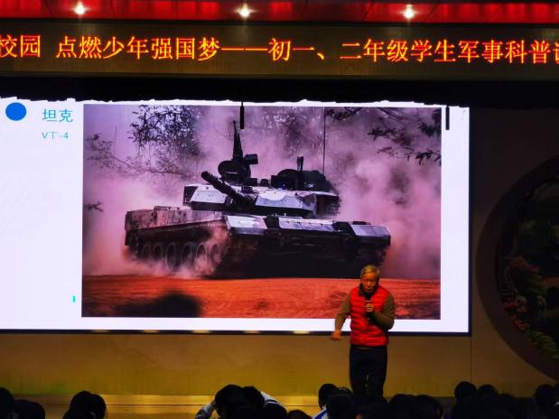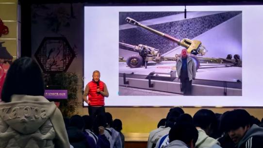 肖方老师作《重兵器火炮》报告。他以从军炮兵的经历开场,结合当今世界动荡形势,以及俄乌、中东、泰柬战场上使用的火炮类型,以丰富的火炮实图,介绍火炮分类、结构与技术特性。火炮由炮身、炮架、反后坐装置等组成,通过发射药燃气压力抛射弹丸。炮身赋予弹丸初速和方向,炮架支撑并调节射击角度。现代火炮多数采用自动装填系统和电子瞄准设备,以提升作战效率。同学们学习到火炮知识,以及现代战争的特点。最后,大家与肖老师的合影为本次专家讲课活动划上圆满句号。三场军事报告,每场都有330多名学生聆听。