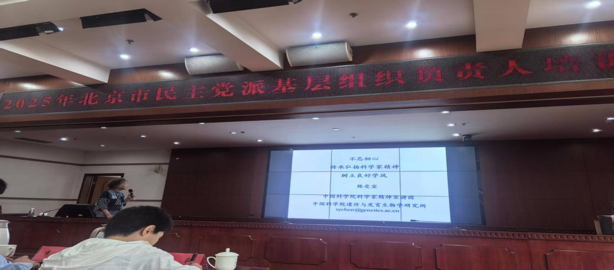 2025年北京市民主党派基层组织负责人培训班在北京社会主义学院举办,旨在推动首都党外代表人士通过学习,进一步明确职责使命,拓宽工作思路,把学习成果转化为强大动力,为推动首都民主党派基层组织建设和多党合作事业发展作出新的更大贡献。9月24日,中国科学院科学家精神宣讲团专家,中国科学院原遗传所所长陈受宜研究员作科学家精神专题讲座,题目是“传承科学家精神,树立良好学风”。