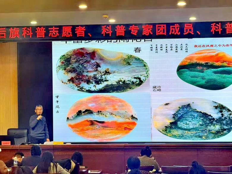 中国地质科学院高级工程师白勇军作《大自然中的岩石及自然资源》报告,讲述三大岩石种类,以及如何识别矿石和宝石。