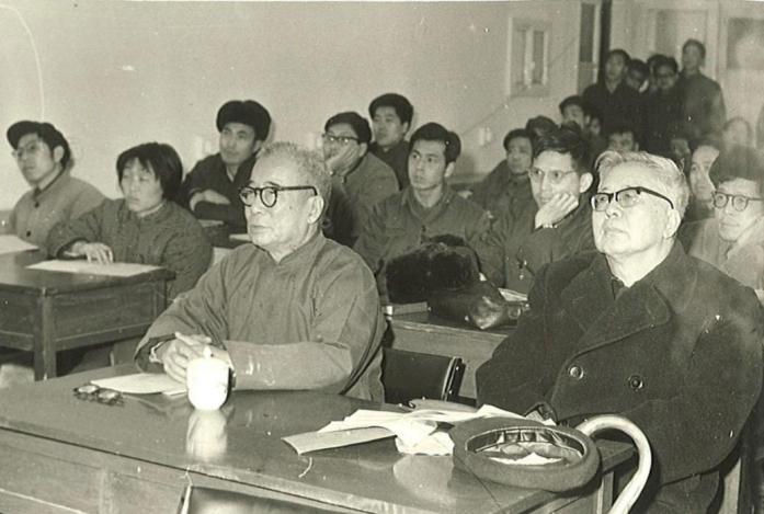 1979年,华罗庚先生(右一)、钱志道先生(中)等在国科大前身中国科大研究生院(北京),听学生论文答辩