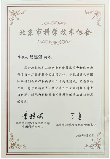 中国科学院老科协常务理事、自动化所分会理事长易建强和自动化所老科协会员刘庆莲获得北京市科学技术协会表彰。表彰中写到:感谢您积极参与北京市科学技术协会和北京老科学技术工作者总会的各项工作,积极投身北京国际科技创新中心和高水平人才高地建设,矢志创新发展,勇于创新争先。值此第九个全国科技工作者日之际,对您为科协事业发展所做的贡献致以崇高的敬意!