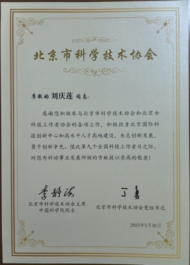 自动化所分会易建强研究员、刘庆莲高工获得北京市科学技术协会表彰
