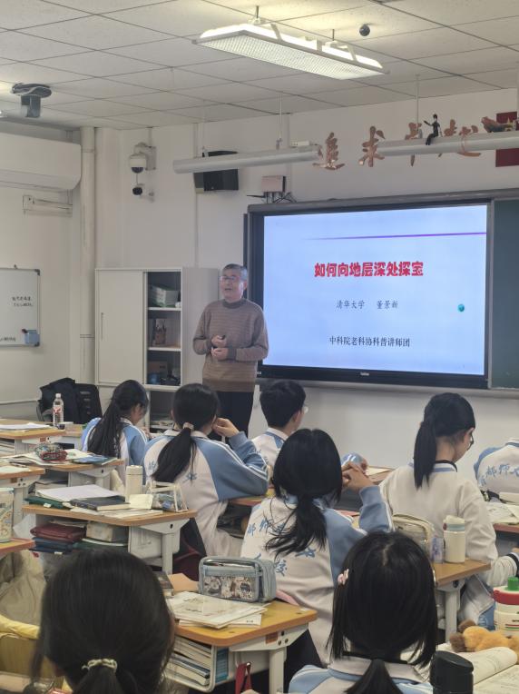 3月16日,中国科学院老科协科普讲师团成员,清华大学董景新教授应北京市教育系统关工委邀请,来到首都师范大学附中第一分校,为初三年级3+1班42名学生作《如何向地球深处探宝》的科普报告,受到热烈欢迎。
