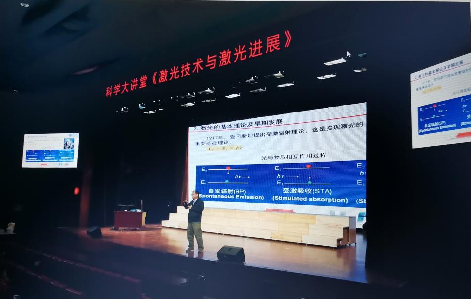 赵震声老师以一个通俗易懂的介绍开场:从工业生产中精准切割的“锋利刀刃”,到医疗领域拯救生命的“精准手术刀”;从光纤通信中传递信息的“隐形桥梁”,到航天探索中丈量宇宙的“遥远标尺”……一幕幕激光科技应用的生动场景,瞬间抓住了全场师生的目光。从无影无形的精准操控,到连接天地的高速通信,激光技术正与人类智慧共同谱写着未来的篇章。