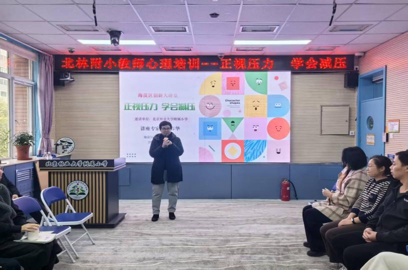 为切实关注教师心理健康,提升教师队伍心理调适能力,营造积极向上的教育氛围,助力教育教学工作高质量发展,2025年10月28日下午,北京林业大学附属小学举办“海淀创新大讲堂”,特邀中国科学院老科协“科普论坛”专家,知名心理教育专家郭春华副主任医师,为全校近60名教师开展了一场题为“正视压力,学会减压”的心理培训讲座。