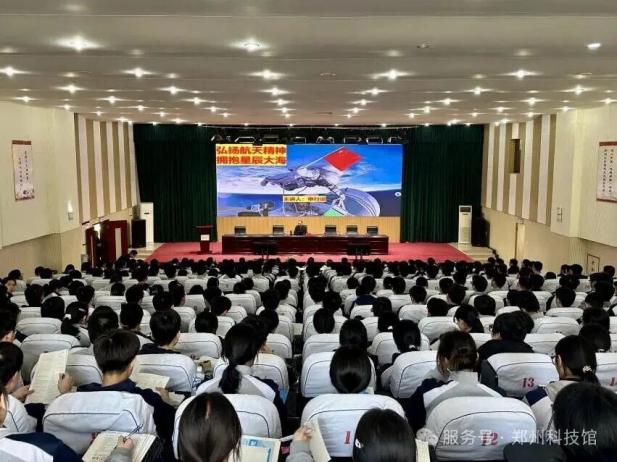 3月20日,申老师在郑州市第九中学作《弘扬航天精神,拥抱星辰大海》的报告,为全校师生献上一堂兼具思想高度、知识深度与情感温度的专题课。申老师结合自身深耕航天领域的丰富经历,从航天员严苛的选拔标准与系统训练流程切入,回顾我国载人航天事业从无到有、由弱变强的不凡历程,梳理中国航天事业取得的辉煌成就,拆解航空航天核心专业知识,让晦涩科学原理变得通俗易懂。他讲述航天员攻坚克难、为国奉献的感人事迹,展现 “中国奇迹” 背后的坚守与付出,深刻诠释 “特别能吃苦、特别能战斗、特别能攻关、特别能奉献” 的载人航天精神。报告现场氛围庄重而热烈,震撼画面与真挚讲述深深触动每一位学子。
